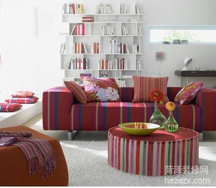 用鮮亮的圖案與素色的物體形成對比,以襯托背景。純正紅色的沙發坐墩渲染了空間的氣氛,使得白色的基礎色不再寡淡,呈現了勃勃的生機,充滿活力。色彩相間、純度很高的窗帷和靠包,賦予了室內活潑、青春的氣息。 案例8 掩蓋房間格局硬傷