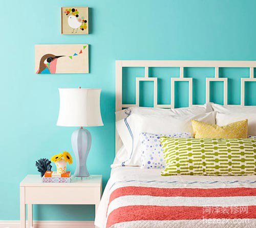 色彩搭配:淺藍色背景墻與白色床頭板對比明顯,更能突出創意設計。 設計點評:床頭板富有創意的設計令臥室增容不少,中式風格的條條框框設計給房間增添了趣味。淺藍色的墻面更加突出了白色的床頭,有利于幾何圖形吸引注意力。兩幅花鳥裝飾畫更加突出了臥室的清新感覺。
