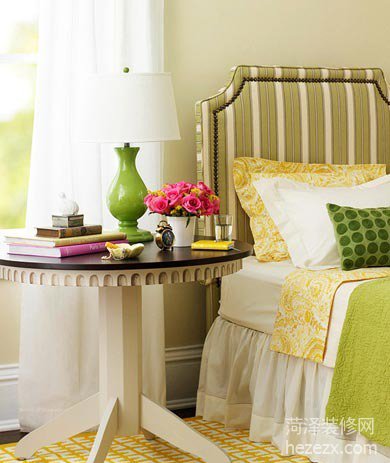色彩搭配:白色的條紋建立在綠色的背景上,搭配黃色的床品與地毯,令空間充滿春意。 設計點評:用帶條紋的床頭做背景墻可以在瞬間抓住人的眼球,成為焦點。黃色的枕頭與地毯,綠色的布包與毛毯,顏色干凈、清脆,充滿春天的氣息。 |