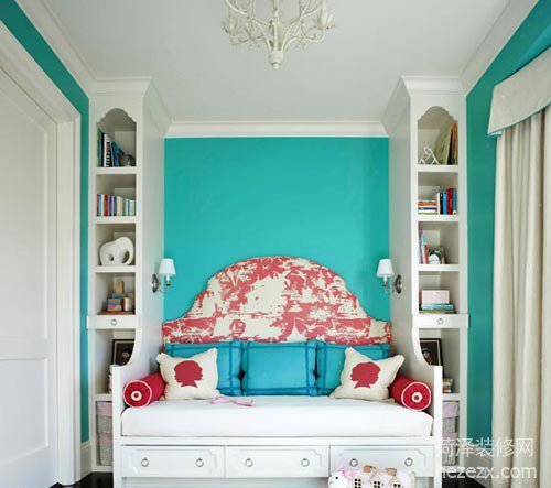 色彩搭配:白色為主打色,搭配漂亮的紅白相間的編織床頭與藍色的墻面,像公主的臥房。 設計點評:一個簡單的沙發床放在角落里并沒有什么不同,但加入一個美麗的編織床頭就大不相同。與之相匹配的印花面料枕頭,創造了一個下午茶時間休閑好去處。