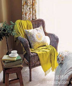 窗前的藤椅和原木質地的案幾質感細膩,骨架硬朗,有效地提升了田園臥室的厚重感。隨意搭配艷色的披毯,顯得清新自然。閑暇時,捧上一杯熱騰騰的茶,坐在這里能體味到一種閑坐庭前靜看云卷云舒的悠然意境。