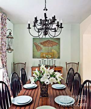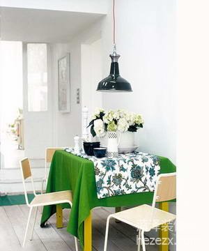 把小餐桌靠墻而放,節省了不少空間。草綠色的餐桌底布和帶大花朵圖案的餐桌布相搭配,營造出了濃濃的田園氣息。