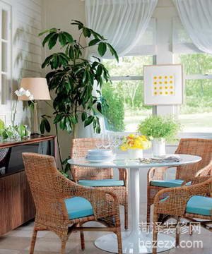 采光充分,色調素雅的餐廳中,自然的藤制餐椅創造出清新的用餐心情。藤編家具是田園風格裝修最喜愛的道具。