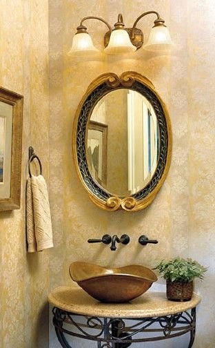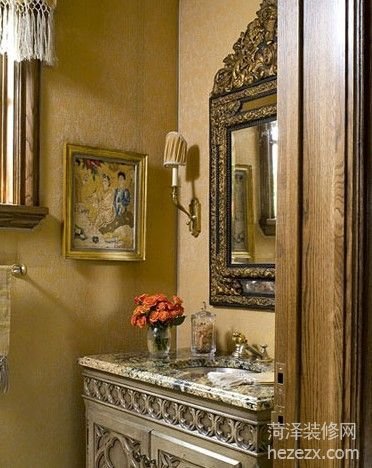 鏤空的獨立臺盆架上金光閃閃的獨立臺盆,赫然的樹立,荷葉邊的設計為整體增加了美感。仿銅的復古龍頭與擦手巾的銅環掛架,成為了空間的點睛之筆,從微小的細節曾加了古典的韻味。