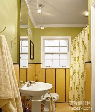 墻面、地板與天花板所使用的土黃、綠色與白色的三色拼接,衛浴間顯然成為了一個生機勃勃的空間。大面積的梳妝鏡,為空間的感的增大上,起到了很大的作用。鏡燈也已簡約為主,從而不影響空間的清新感覺。 |