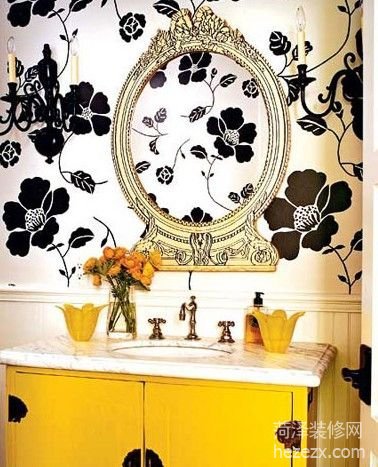 空間整體看來簡潔明快,黃色的臺盆柜帶動了這個空間的活躍感。看似簡單的墻面,其實花費了極大的功夫,手繪的墻花,具有獨特的不可復制性,當然梳妝鏡也是獨一無二的,它也是純手工繪制的哦。