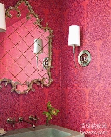 紅色的印花壁紙,讓墻面不單調。一體式的仿石紋水槽,帶有更多的自然氣質。精工細作的梳妝鏡,帶有人造花朵的裝飾,鏡面中的網格圖案,讓鏡面更具魔幻性。