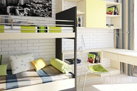 空間裝飾 以不同顏色的床單裝點雙層床品,在背景墻上,張貼一張摩登城市的素描畫,為空間融入了現(xiàn)代時尚的元素。墻面設(shè)計也頗有特色,磚塊狀的圖案,很有新意以及個性。