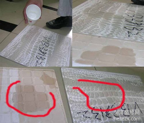 三、看吸水率 吸水率的大小是瓷磚質(zhì)量的一個(gè)重要標(biāo)志。將一小杯水倒在磚體的背面,水消失得越快說明吸水率越高,質(zhì)地越疏松,強(qiáng)度越弱,反之則反。