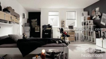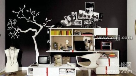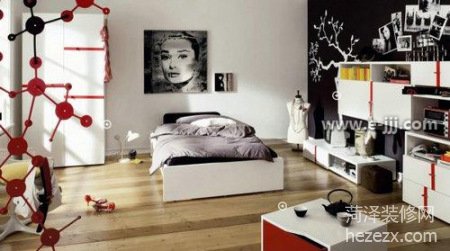 選取黑白紅三種經典色奠定房間的基調,舊式小電視的陳列于非主流的大幅照片突顯主人的個性,組合收納與工作桌融為一體。