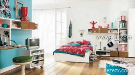 藍紅白的顏色明快清新,收納依墻而立,移動電視茶利于最優化視角,床頭柜兼工作臺,盡享席地而坐的溫馨。