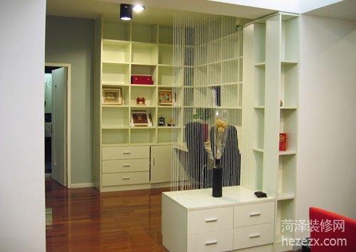 將墻面設計成擱板 試著將整個墻面做成擱板柜,形成有多個小空間的擱板。不僅可以收納日常用品,還可以放一些裝飾品,使房間表情豐富生動起來,如果覺得擱板上面放的東西太多太雜,可設置一個簾子,將其遮蓋住。