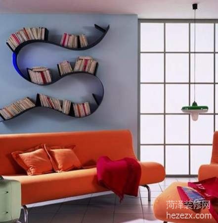 如果您家客廳的主題墻是黑色或灰黑色色調(diào),則可采用中國紅顏色的擱板來裝飾您的客廳 顏色選擇之淡色調(diào)