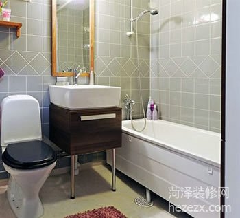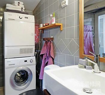 小面積的衛浴間也可以毫不凌亂,紫紅色的毛巾和地毯增加了衛浴間里的浪漫情調。墻面安裝的木質擱架用來放置毛巾等雜物,節省空間又有很強的收納能力。 |