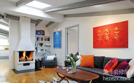 由于房頂上的天窗關系,客廳里的光線非常充足。客廳整體色彩干凈,淺色的背景墻和地毯讓空間基調利落明快,深灰色的沙發與其對比,加上紅色、綠色的裝飾配件,和諧的色彩搭配不僅現代感強,且不失活潑。 本文來自菏澤裝飾網