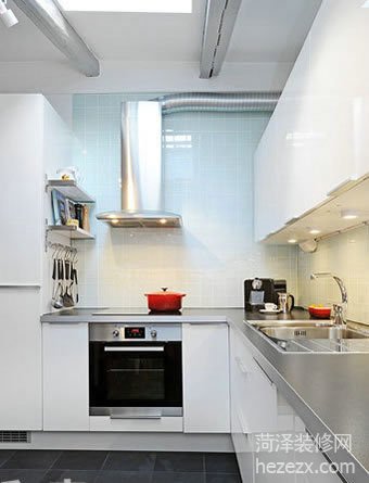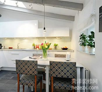 廚房采用了非常潔凈的白色,白色的廚柜,白色的料理臺面與白色的天花板渾然一體,有種“不食人間煙火”的清雅感覺。在廚房旁邊放置了一張同樣是白色的餐桌,把就餐區與烹飪功能合二為一,不僅方便而且干凈。