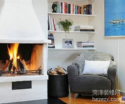 凹墻處正是安裝擱架營造閱讀角的最佳場所。搭配上一個寬大而舒適的布藝沙發,手感柔軟的毛氈顯得親切而溫馨,給人以質地厚實的感覺,能有效增加居室的分量感,令空間快速升溫。