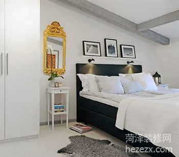 臥室采用了黑色和白色的對比分割,大膽而利落,彰顯出十足的年輕氣息。配合復古金色的雕花鏡面,既打破了單調感,豐富空間變化的同時也提升了房間的藝術品質。