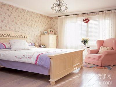 麥芽黃為底的壁紙上,粉花綠葉的花朵圖案大方自然地鋪卷著,與原白色仿木家具、水晶調燈組合出另一種溫馨浪漫。