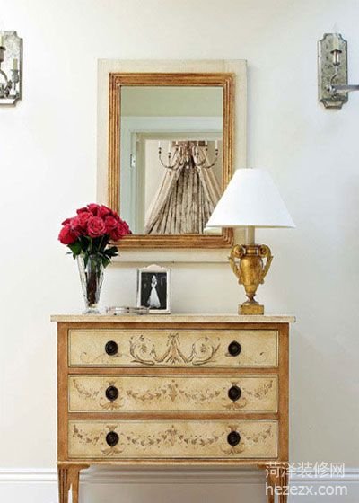 一只邊柜、一面墻鏡,再加上兩三件小飾品,便可以組合出一個頗有情調(diào)又很實用的小型玄關(guān),不僅方便臨時收納零散物品,為出門整理儀容提供便捷,也會讓空白的墻壁美觀生動起來。玄關(guān)家具不用很復(fù)雜,一只可收納物品的邊柜即可,但墻鏡、臺燈、壁燈等細(xì)節(jié)的搭配,則一定要選擇與小桌一致的風(fēng)格,以使玄關(guān)顯得協(xié)調(diào)有致。可以用色調(diào)艷麗的花束來進(jìn)一步調(diào)劑玄關(guān)色調(diào),平添不俗味道。 |
