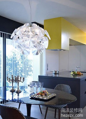 餐廚空間的白墻搭配上黑色的桌椅,經典的搭配不禁讓人怦然心動。反光的大理石桌面讓整個空間簡約中透著精美質感。頭頂的花樣吊燈就像朵朵盛開的鮮花構成,顯得如此生動美麗,讓人覺得在這樣的餐廳里用餐也是一種享受。