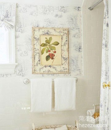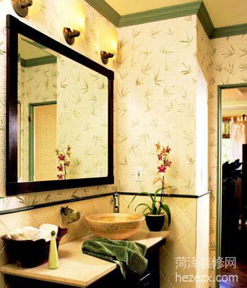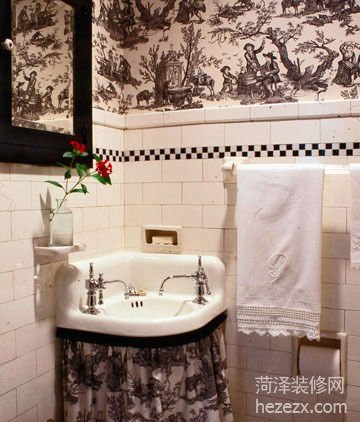 現(xiàn)代人除了重視衛(wèi)浴間的舒適度外,也漸漸對(duì)其時(shí)尚度更加地關(guān)注起來(lái)。無(wú)論是何種風(fēng)格的衛(wèi)浴間,墻面永遠(yuǎn)是空間里裝飾大體。普通的墻磚已經(jīng)過(guò)時(shí),變化多端的馬賽克也不再新鮮,具有防水功能的壁紙,儼然成了豐富空間格調(diào)的首選裝飾材料。再加上恰當(dāng)?shù)拇钆洌亲屇愕男l(wèi)浴空間就變得與眾不同。 本文來(lái)自菏澤裝飾網(wǎng) 整面墻底部鋪有白色墻磚,點(diǎn)綴夸張圖案的黑白壁紙,降低了衛(wèi)浴間的拘束感。黑白兩色棋盤格的腰線與壁紙花紋的風(fēng)格相吻合,為普通的衛(wèi)浴空間帶來(lái)充滿另類的奢華感。白色的潔具和配套的布藝,共同營(yíng)造出一種簡(jiǎn)潔版的都會(huì)風(fēng)格衛(wèi)浴間。