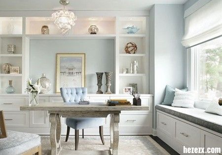 米色系的書房,很好的符合書房所需的安靜雅致氛圍,棕色古舊書桌椅是其間不錯的深色點綴,同時沙發采用神秘的藍色外觀,也是不錯的調劑色。窗戶所在的墻面全都被展示格所占據,下方做成了柜體狀,留出空間當成飄 ...