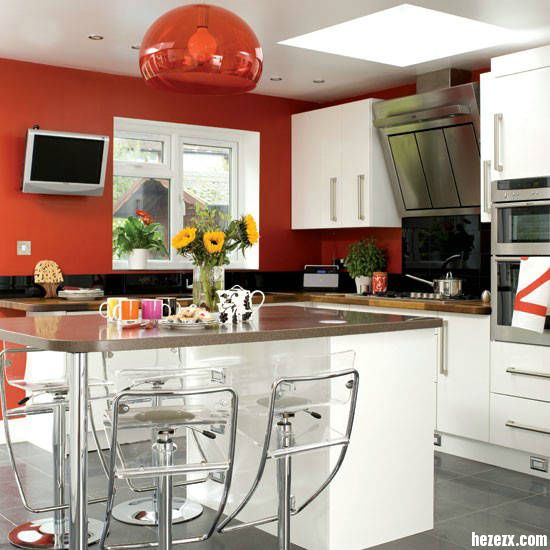 大紅色烤漆的櫥柜顯得非常驚艷,但廚房因此也少了幾分醬醋油煙的家常味。 一字形的廚房是小戶型居室的常規(guī)配置,因?yàn)樽罟?jié)約空間。墻壁上的置物架是其中的亮點(diǎn)。