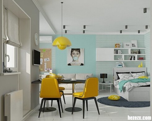 從蒂凡尼藍,到醒目的明黃,高格調的灰,無不彰顯了這位時尚從業女性的格調追求。 門口的灰色墻紙營造一種高格調,玄關做成梳妝鏡,更加時尚有創意