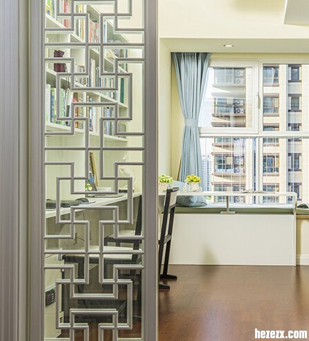 中式特色鏤空隔斷設計,簡約大方。棕色木地板,鋪陳平整,配以木質書桌椅,有幾分大自然的味道。雙人閱讀桌面,裝滿書籍的展示架,營造出溫馨的家居氛圍。右側還特意設置了休閑區,可以供主人小憩。